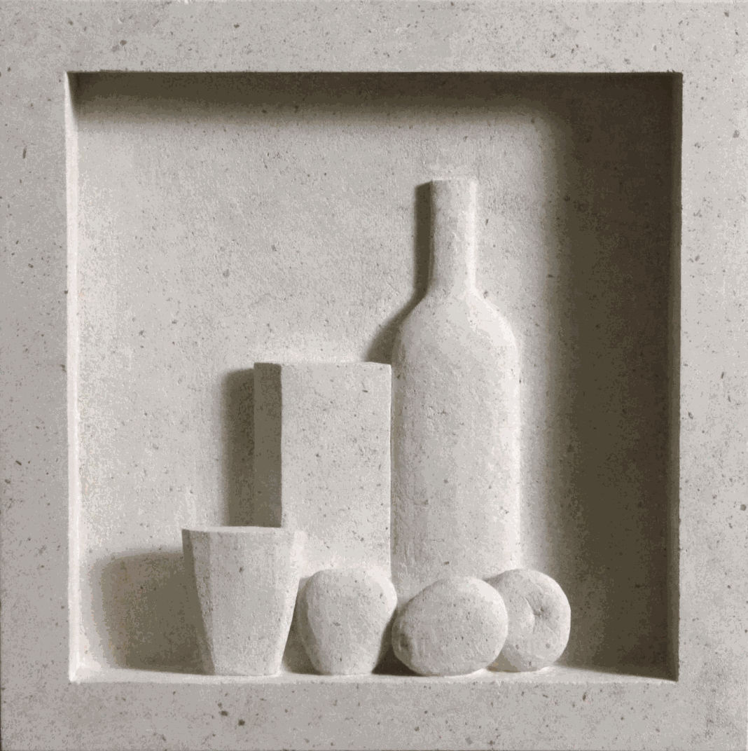 Working with still life in stone, Gabriele Risso's work echoes these themes by carving everyday objects—bottles, vessels, and tables—into limestone, solidifying transient moments into permanence. The carved recesses and shadows within the stone create an interplay between absence and form, reinforcing the exhibition’s meditation on memory, space, and material.