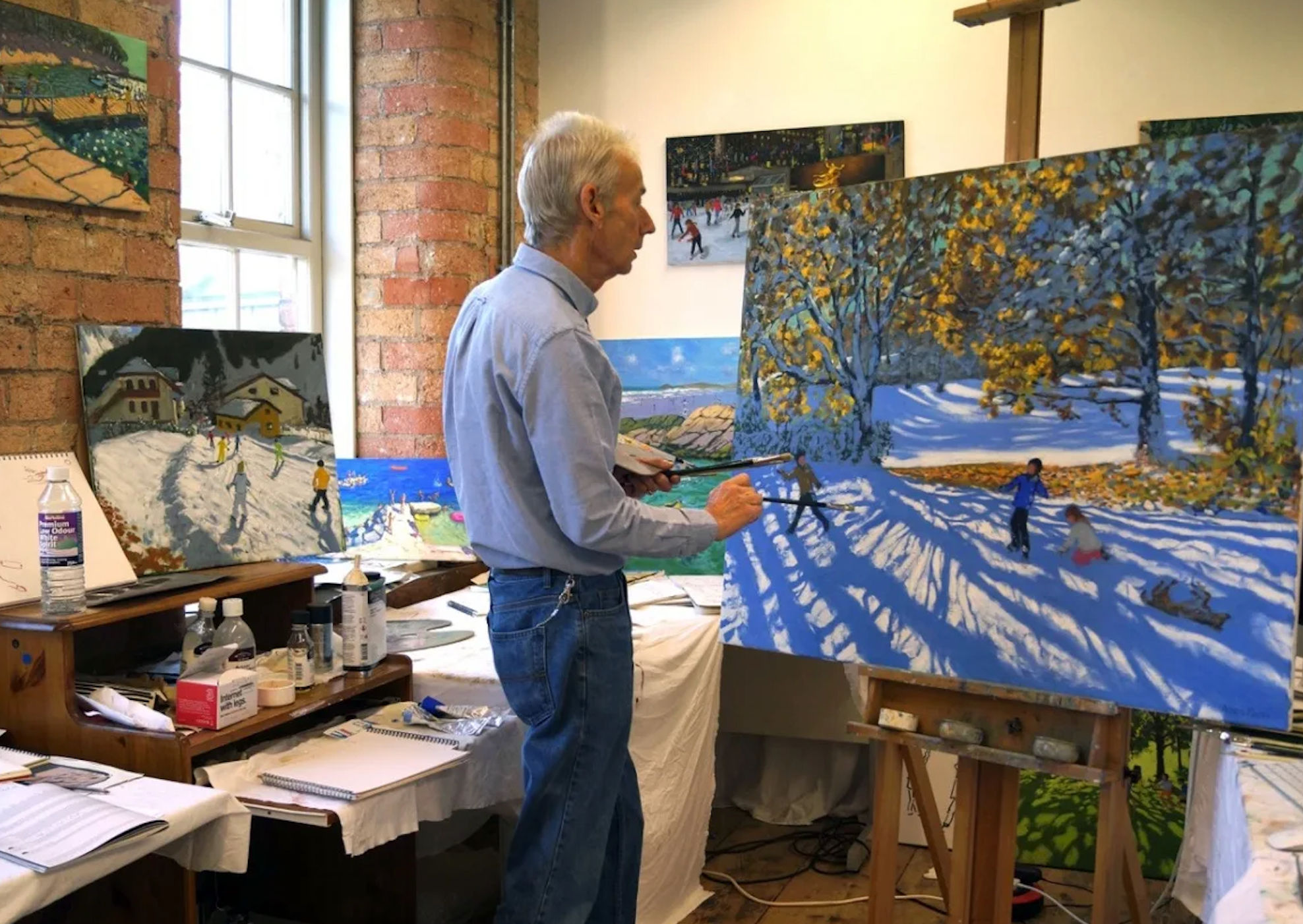 From the sunlit courtyards of Greece to the ski slopes of France and golden shores of Tenby, Macara’s paintings capture the joy, spontaneity, and warmth of ordinary moments. His distinctive use of colour and shadow evokes both a sense of place and the fleeting beauty of light. Whether it glows on a child’s swing, dances across whitewashed walls, or glints on snow covered pistes.